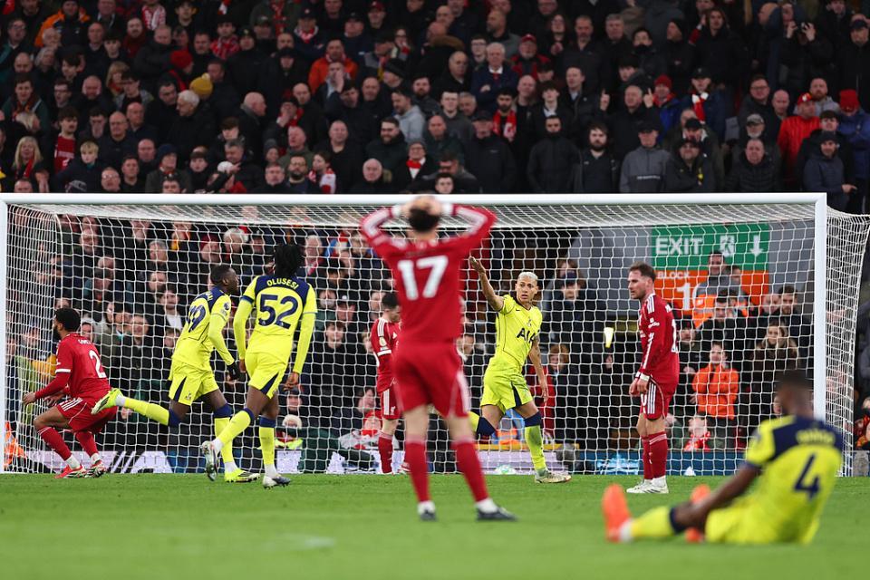 然而就在面对这样一支士气低迷的“残阵”热刺,利物浦却在主场破门乏术,仅仅是依靠索博斯洛伊的任意球打进1球。在迟迟没有取得更多进球锁定胜局后,利物浦也付出代价。